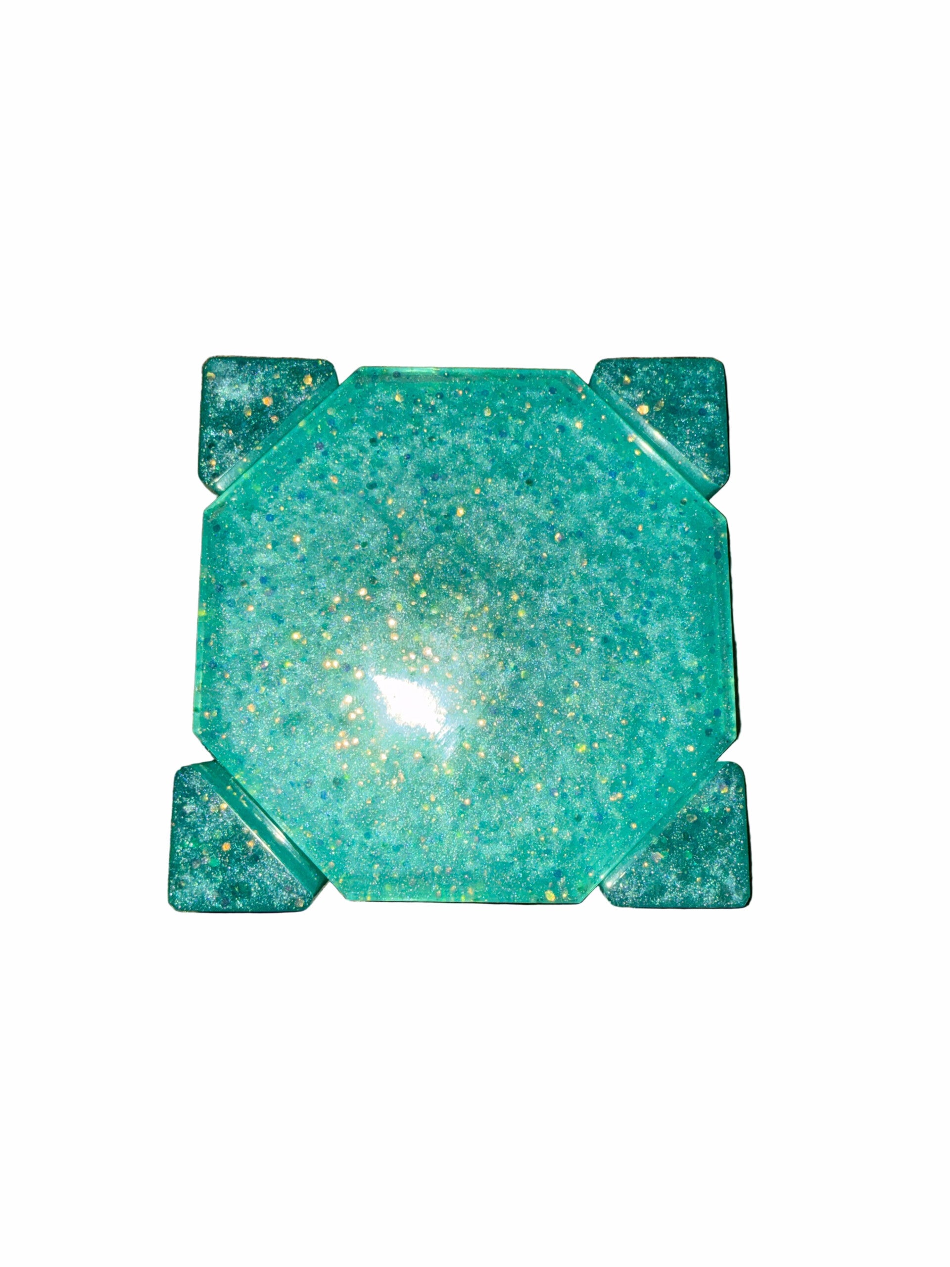 Geef jouw interieur een betoverende touch met deze prachtige, handgemaakte octagon onderzetters. Ze zijn gegoten uit hoogwaardige epoxyhars en verrijkt met een schitterende turquoise kleur vol subtiel glinsterende sparkles. Elk stuk is volledig uniek dankzij het ambachtelijke gietproces.